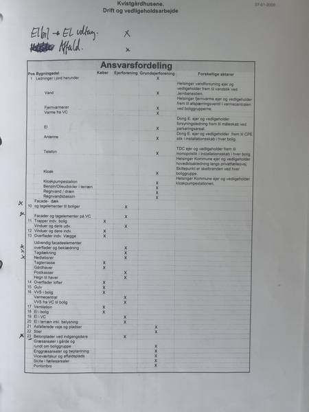 Forsikring: ejerforeningens forsikring er en husforsikring da ejerlejligheder forsikres således. Den dækker kun hvis man har vedligeholdt lejligheden løbende så som afløb, fuger i badeværelse, udbedret fliser der er revnet m.m. og har dokumentation for de indre installationer er lavet af en certificeret håndværker.